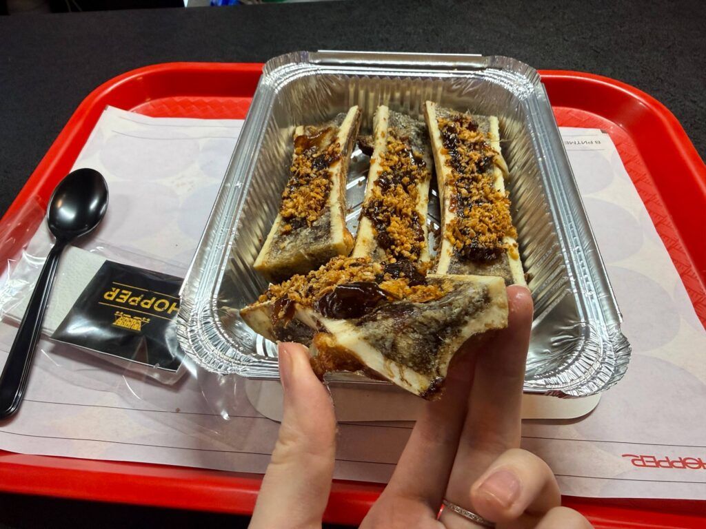 Сочетание выходит неожиданно гармоничным: сладость и хруст лука оттеняют нежность и солоноватость мозга, создавая неповторимый вкус. Внутри кости полые, но продукта много – одной порции хватит на нескольких человек. Это сытно, натурально, очень калорийно (около 800 калорий на 100 грамм продукта) и полезно: натуральный коллаген важен для кожи и суставов. Доесть всё блюдо на месте не удалось, поэтому формат кафе to go оказался очень удобным. Приборы и салфетки также дают в запечатанных гигиеничных пакетиках.