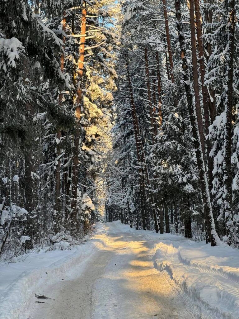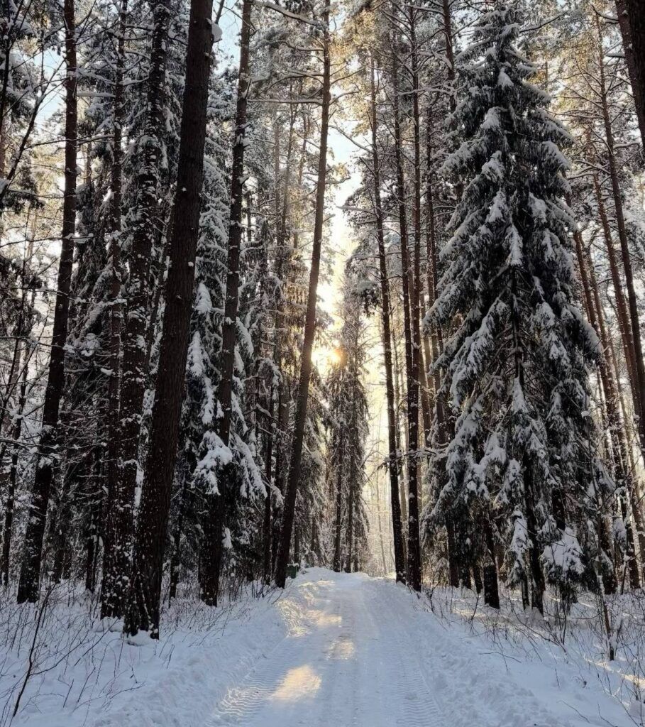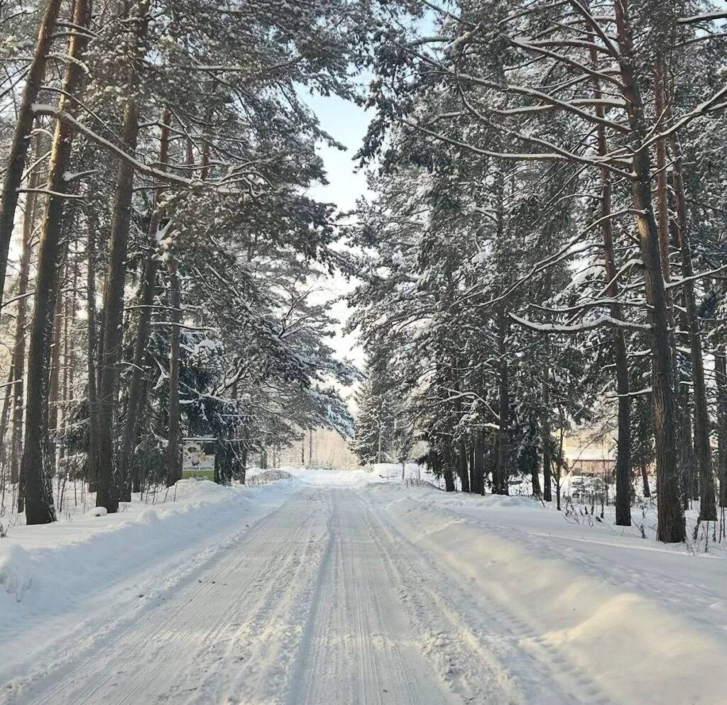 Широкая дорога, ведущая к Лесному озеру живописна даже в пасмурный день. Здесь получаются отличные динамичные фото в движении или выразительные силуэты на фоне заснеженного леса.