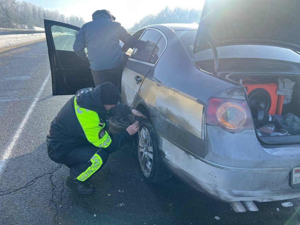 На трассе под Минском инспекторы ГАИ помогли водителю с пробитым колесом