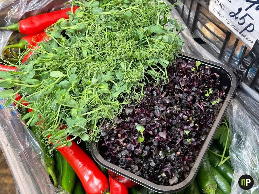 Зелёные стеллажи в павильонах разбавляют зимний пейзаж и помогают сделать рацион легче. Укроп, петрушку и зелёный лук продают по 20 рублей за килограмм, салаты подешевели и тоже уходят по 20, айсберг по 9 рублей, острые перчики чили продают по 25 рублей, корень имбиря стоит до 20 рублей. Новинка этой недели – терпкая микрозелень тёмного цвета.