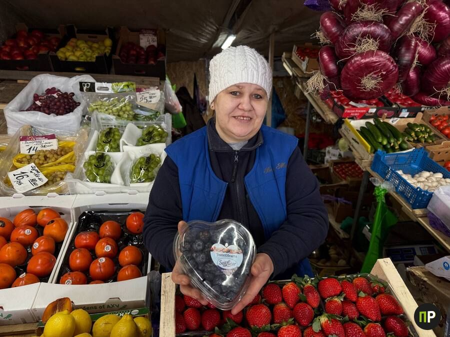 На рынке еще есть крупные ягоды голубики в коробке в форме сердца и большая импортная клубника. Продавец Наталья объясняет, почему сейчас хорошее время брать ягоды: