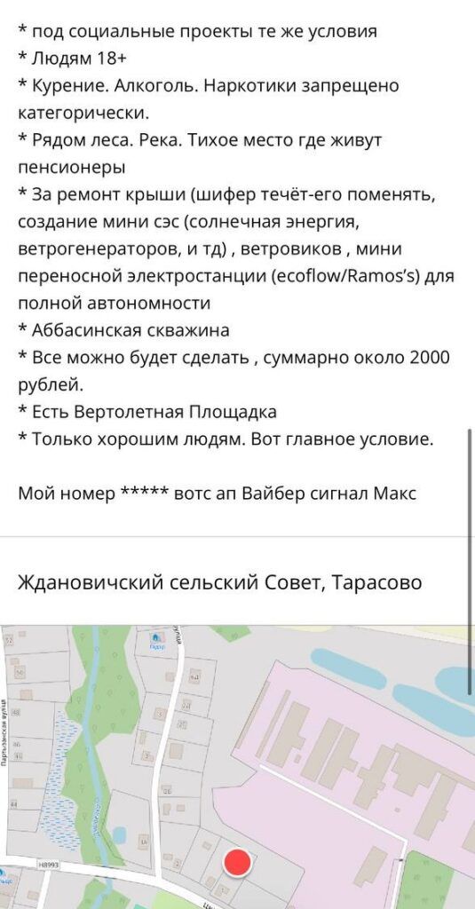 В аренду с очень гибкими условиями выставлен дом на 18 сотках земли. Находится он на берегу реки Птичь, в агрогородке с хорошей репутацией и видами на лес, говорится в объявлении. Звучит как мечта, правда? Но только Тарасово — это деревня, а река Птичь не протекает через нее. Да и в целом, чем дальше читаешь, тем больше понимаешь: нужно все воспринимать через юмор.