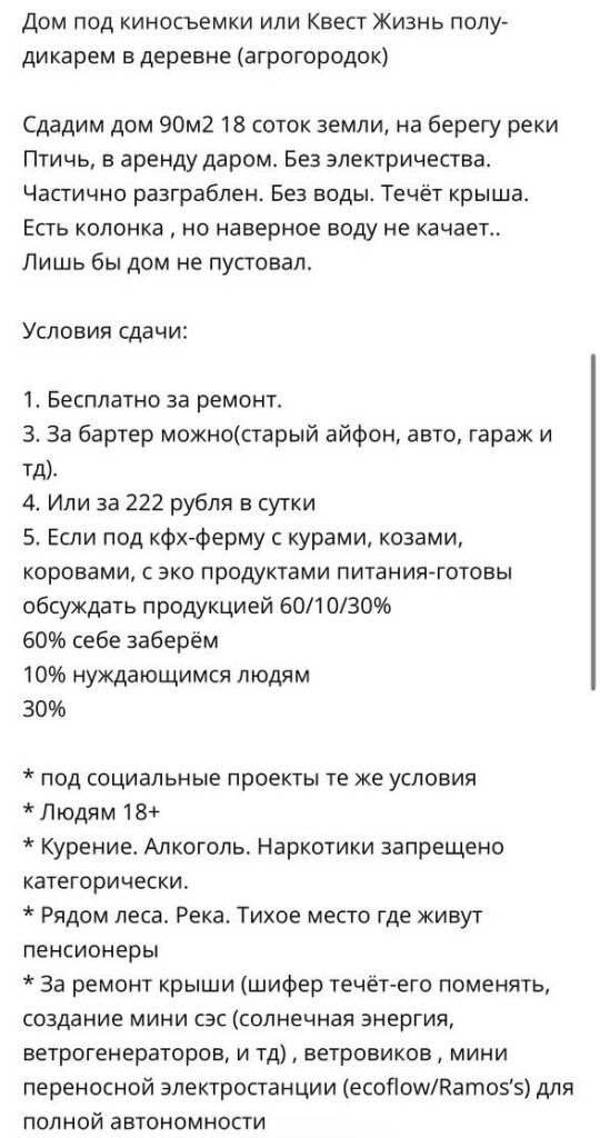 Это объявление обсуждает весь Threads: в Тарасово сдают дом без света и бартером на айфон