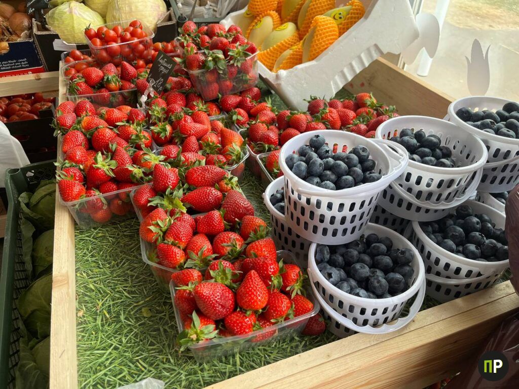 На прилавках есть и ягоды — клубника по 18 рублей за кило (лоточек обойдется в 10 рублей), крупная голубика (12 рублей за 100 грамм).