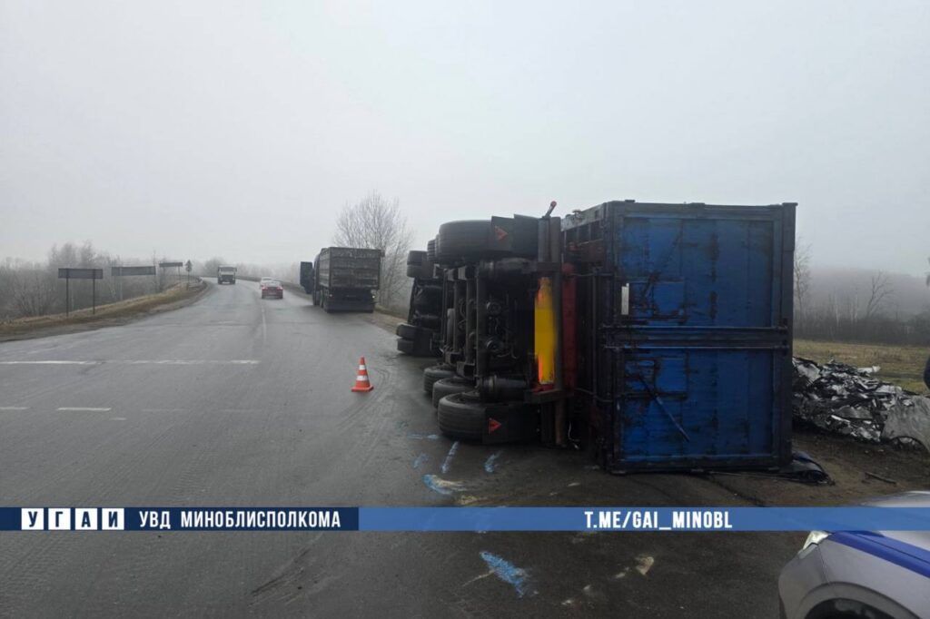Опрокидывание автомобиля произошло в 14:35. Водитель грузового автомобиля MAN в сцепке с полуприцепом, 59-летний житель Могилёвской области, при повороте на перекрестке налево допустил смещение груза в полуприцепе. Авто опрокинулось на правую обочину.