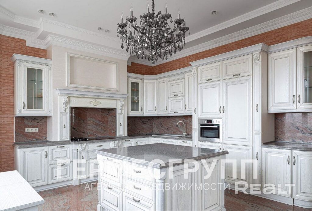 На первом уровне — кухня-гостиная с печью и SPA-комплекс (бассейн, баня). Второй уровень отдан под парадные приемы: просторная гостиная с выходом на террасу 110 м², кинозал, кухня с островом. Третий уровень — мастер-зона: спальня с гардеробной, камином и ванной, плюс две спальни и видовой кабинет. На четвертом — каминный зал, тренажерный зал и обзорная комната с двумя балконами.