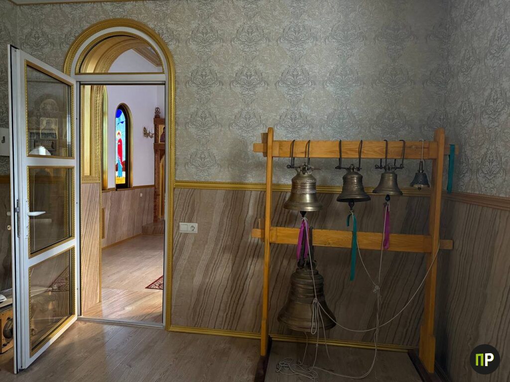 Именно здесь, на втором этаже, звучит колокольный звон. Пока что колокола находятся внутри — звонят прямо под куполом, но уже согласовали проект на строительство отдельной звонницы. Она будет располагаться через дорогу, на другом конце конструкции старого контрольного пункта пропуска.