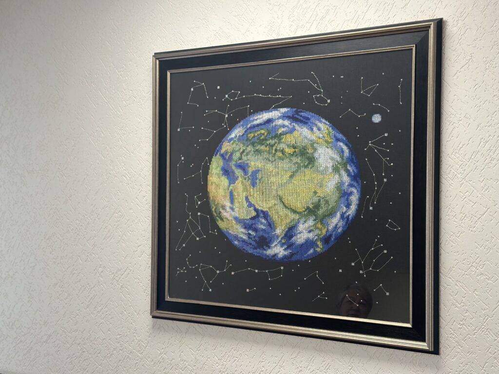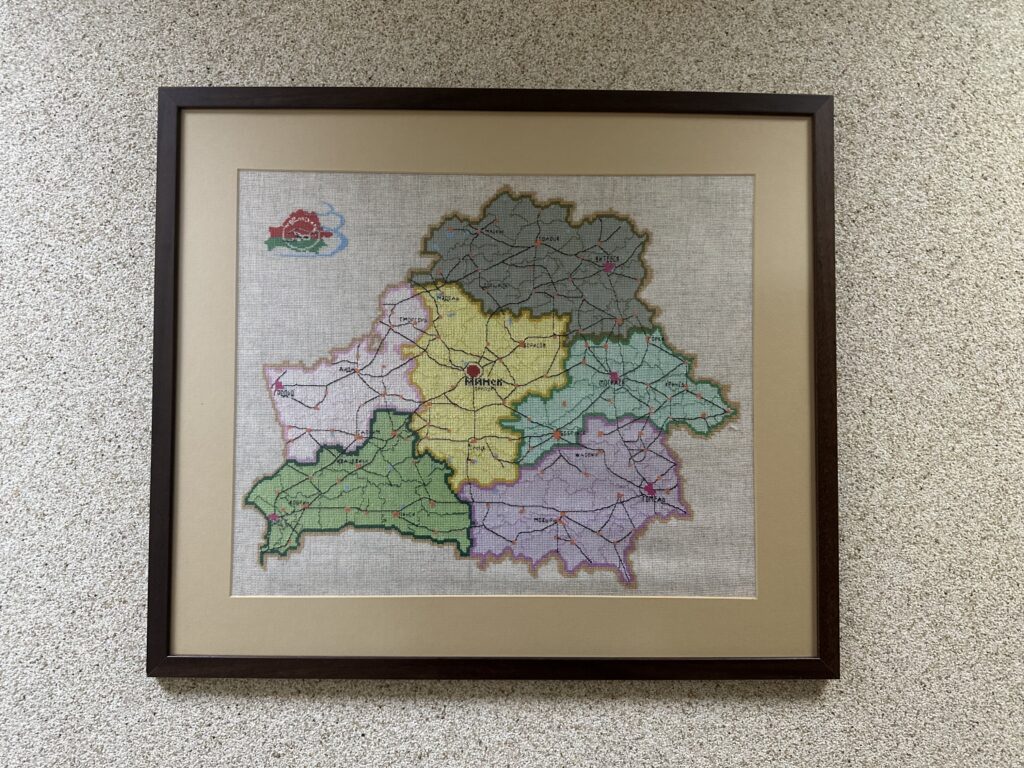 Героиня не останавливается на чем-то одном. Она показывает и небольшие салфетки (прекрасный подарок коллегам на праздники), и грандиозные полотна. Три ее масштабные работы: «Планета Земля», «Карта Беларуси» и вышитое здание родного предприятия БелПСХАГИ – уже много лет украшают стены на работе. Идею изобразить здание подал директор.