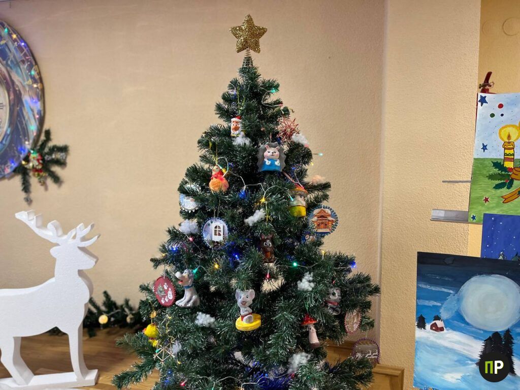 Заместитель директора по учебно-воспитательной работе и социально-психологической реабилитации Елена Лабуда провела для гостей экскурсию по выставке «Рождественское творчество». Гости увидели детские картины и поделки. Кстати, все игрушки на елке в зале тоже были сделаны руками ребят.
