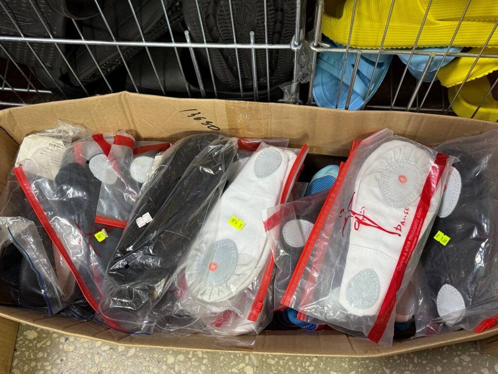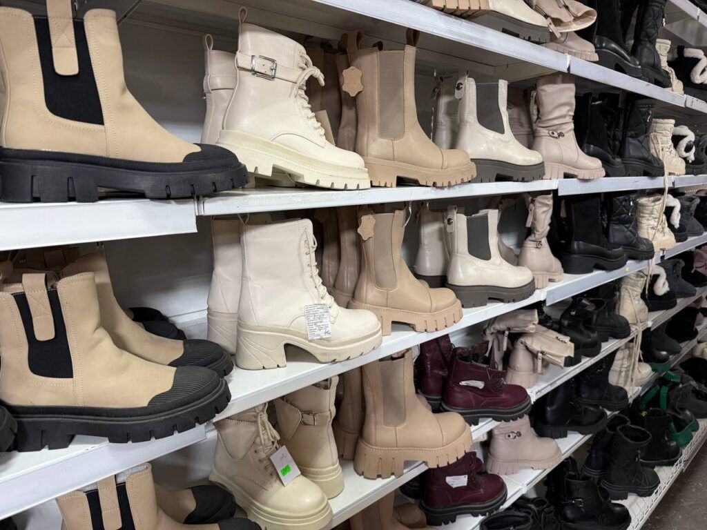 Выбор обуви огромен. Чешки для танцев — 9 рублей, резиновые шлепанцы — 13. Полки уходят вглубь зала: от простых тапочек до моделей с логотипами известных брендов («New Balance», «Puma»), цены на которые стартуют от 50-60 рублей. На некоторых парах есть маркировка «Честный знак» (которая должна защищать потребителей от подделок). С такой отметкой мы нашли кеды «Nike» по 69 рублей, кроссовки «Adidas» от 59 до 69. Осенние ботинки можно найти от 38 рублей, а сапоги обойдутся уже в 60–70. Детская обувь в среднем до 35 рублей, много школьных туфель для сменки.