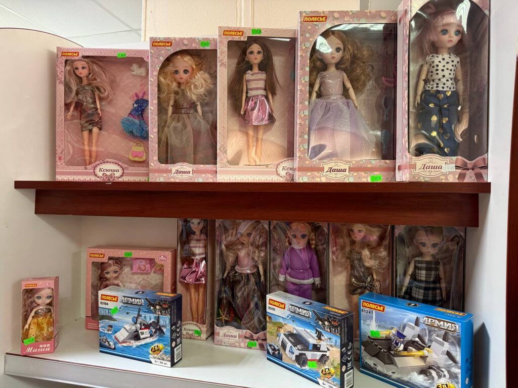 Игрушки в основном от «Полесья»: цены от 20–25 рублей за наборы до 60 за крупные вещи. Куклы — от 17 до 40, конструкторы — от 15 до 35.
