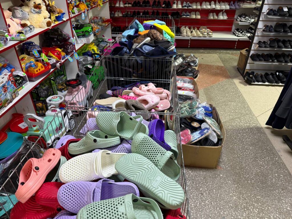 Внутри магазина — как на рынке: есть одежда, обувь, игрушки, техника и даже мебель. Товары буквально на все случаи жизни, и действительно недорого. Ценники встречаются не везде — где-то указаны на коробках или бирке, где-то просто написаны маркером на подошве или вовсе отсутствуют, но покупателей это не смущает.