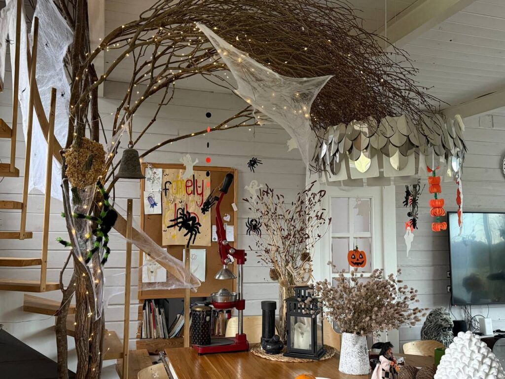 Почти каждая деталь дома Михалевичей продумана и выполнена с минимальными затратами. Прямо посреди кухни стоит настоящая засохшая ива: её нашли в лесу и пронесли в дом через окно. Ветки проходят до второго этажа и украшены гирляндами. Сухоцветы для декора заготовили со своего участка. А среди клумб и полок спрятали десятки миниатюрных феечек.