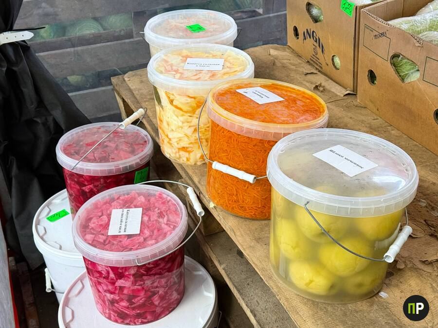 Своего покупателя уже ждут соленья и мясные изделия. Большие вёдра с квашеной капустой, морковью и яблоками продают по 4 рубля за килограмм.