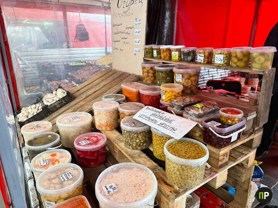 В небольших баночках и ведёрках продают более сложные закуски: маринованные грибочки, перчики, ассорти — до 85 рублей за упаковку в зависимости от состава и размера. Появилось и домашнее сало по 25 рублей и колбасы по 28 за килограмм.