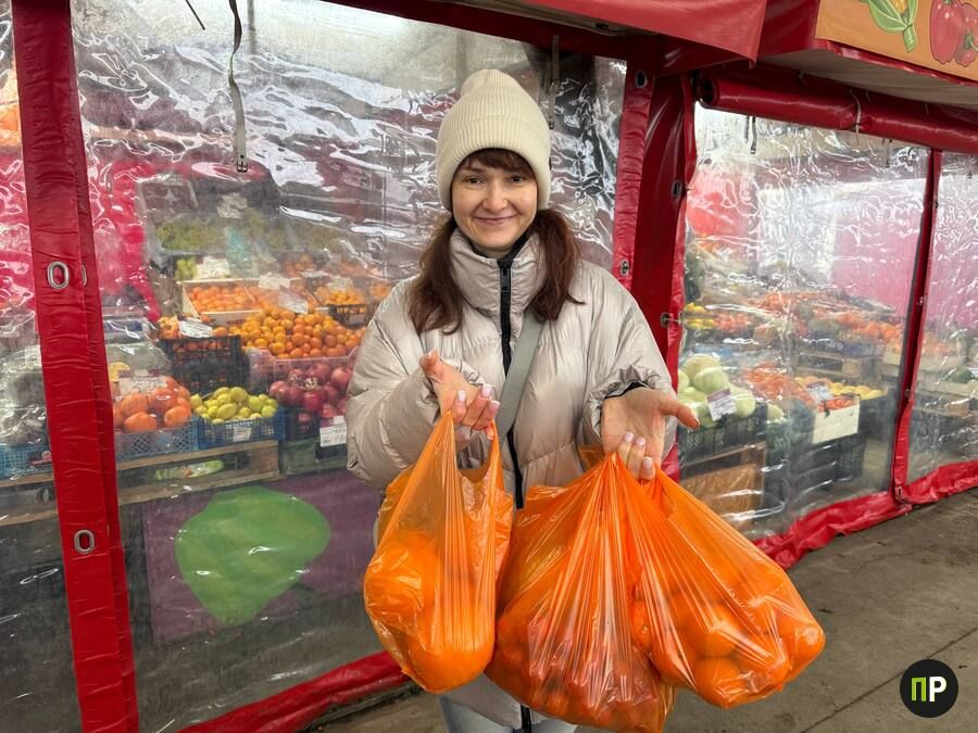 Ходить по рынку в мороз комфортно только в очень тёплой одежде, потому как ветер пробирает, но внутри павильонов тепло. Покупательница Ирина, которая приехала специально за фруктами и овощами, рассказала о своей корзине с юмором: