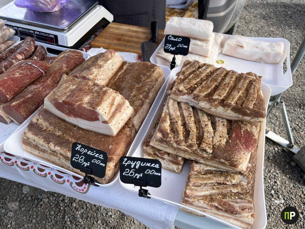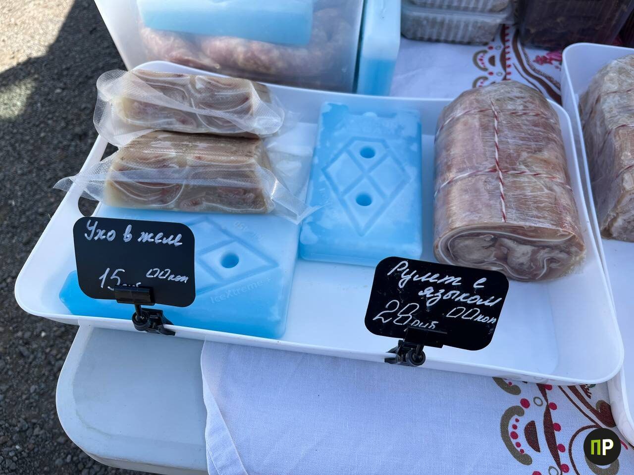 Любителей мяса ждал солидный выбор от продавца из Заславля. Хозяйка рассказала, что засаливает всё прямо к ярмарке, чтобы сохранить максимальную свежесть. Грудинка, корейка и полендвица — в районе 25 рублей. Сало — 27 рублей. Есть домашняя колбаска за 35 рублей, сальтисон за 16. и настоящий деликатес — свиное ухо в желе за 15 рублей.