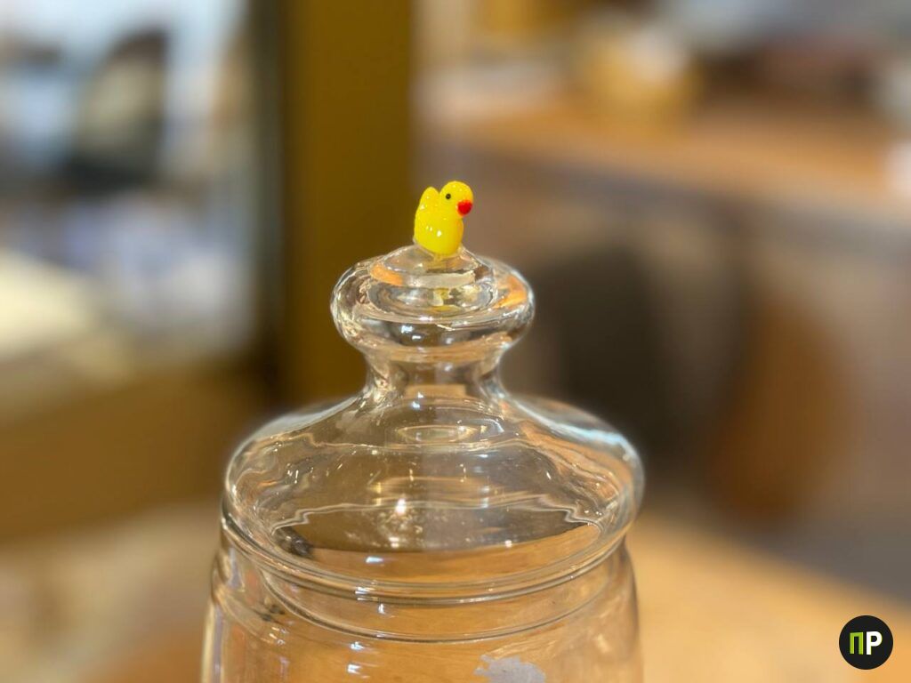 Переступив порог заведения, очередей мы не увидели, зато жёлтые пластиковые утки были везде. Одна расположилась на стеклянной банке со сладостями.