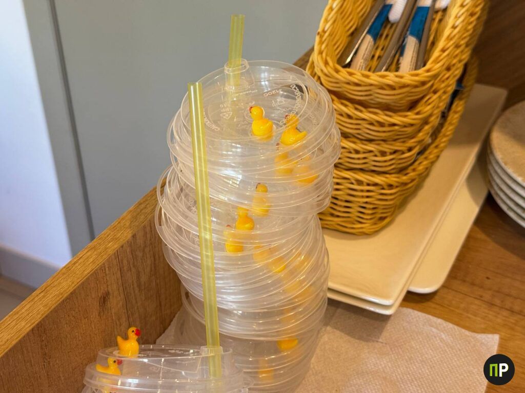 В зоне с салфетками и трубочками на крышках тоже были наклеены уточки. И у бариста за стойкой мы увидели те же крышечки. Людей особо не было, но периодически кто-то заходил.