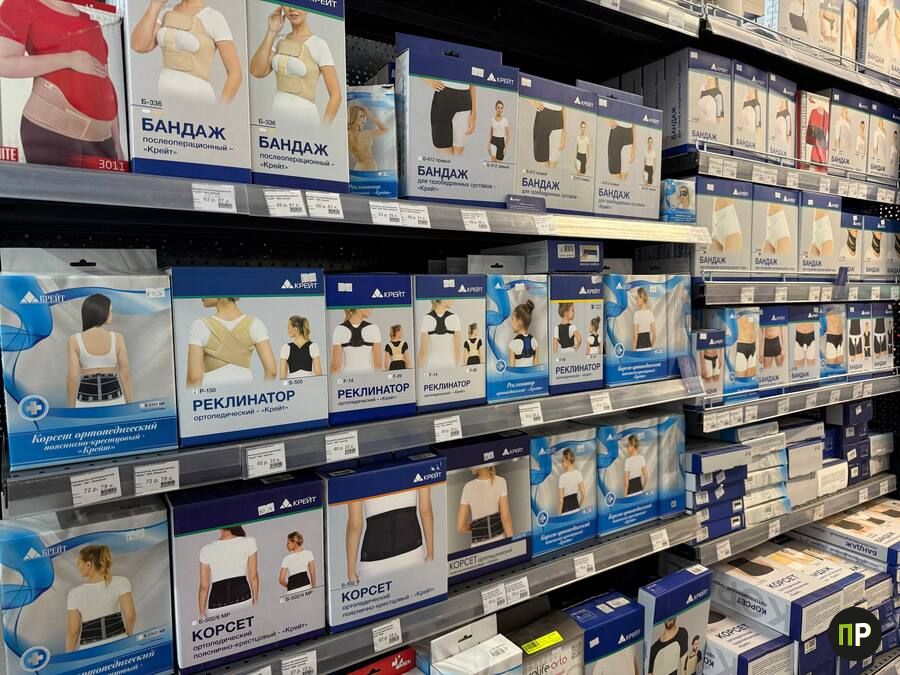 Рядом — впечатляющая линейка бандажей и корсетов: для беременных, послеоперационные, поддерживающие для поясницы и коленей. Готовьтесь отдать от 17 рублей за бандаж на коленный сустав.