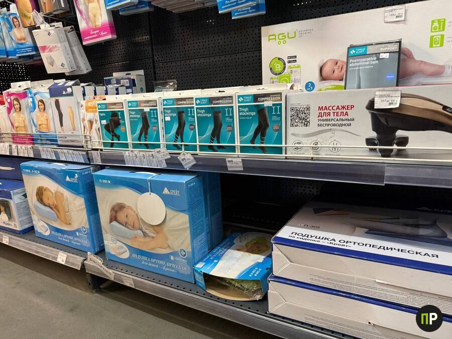 Отдельного внимания заслуживают товары медицинского назначения. На стеллажах представлен большой выбор ортопедических подушек для новорождённых, взрослых. Цены на них начинаются от 16 рублей.