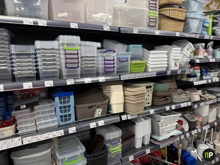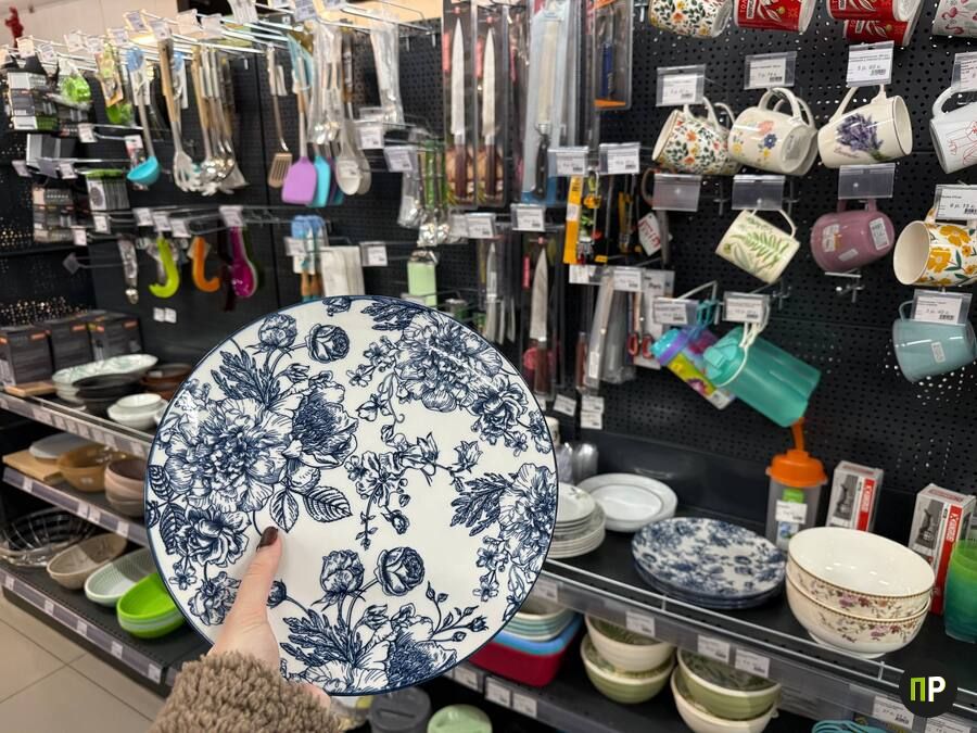 Цены на контейнеры, вёдра, пластиковые корзины и флаконы стартуют от пары рублей. Посуды немного, но попадаются стильные вещи вроде фарфоровой тарелки с принтом за 14,5 рубля.