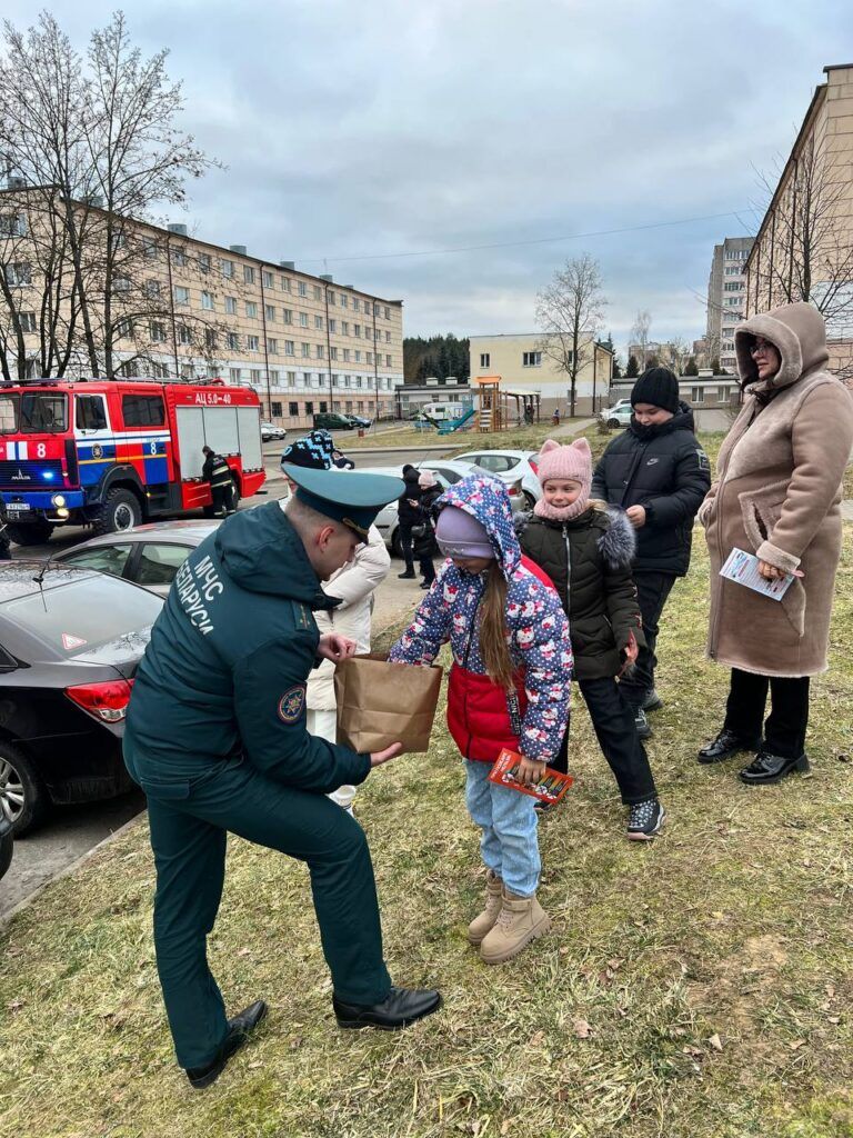 Основные правила работники Минского РОЧС напомнили жильцам общежития. Детей ждал приятный сюрприз: конфеты и возможность поисследовать пожарную машину. Взрослым раздали наглядно-изобразительную продукцию.