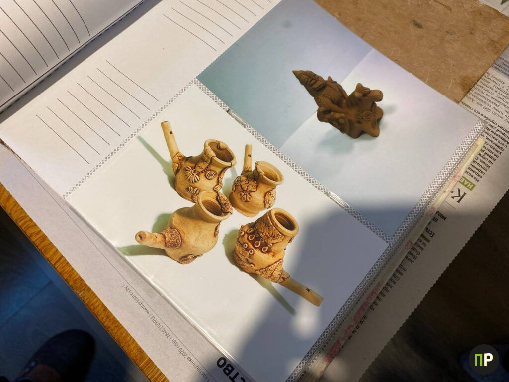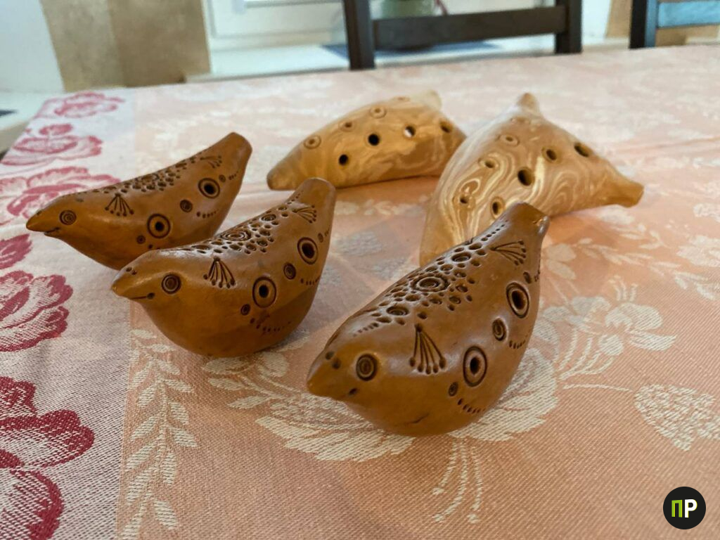 — Вот окарина, — берёт в руки один из инструментов Денис, — на неё уходит до двух часов работы, без остановки. Потом она сохнет три дня. А в день могу сделать много изделий: и свистульки, и птичек, и окарины. Таким образом в месяц на всё уходит до 60 килограммов глины.