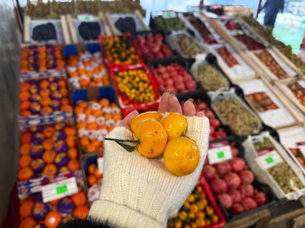Эта часть рынка всегда особенно шумная — продавцы уже принимают заказы и активно формируют партии к праздникам.