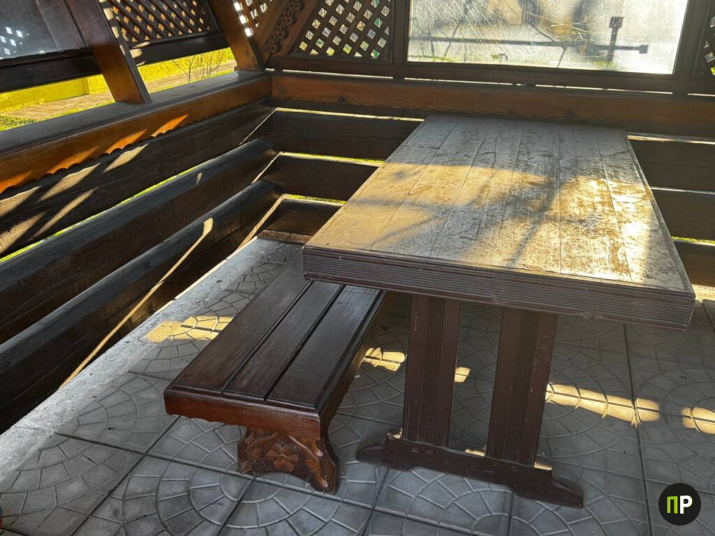 Помимо дома, на участке красуется большая ажурная беседка. Внутри стоит массивная мебель — столы и скамейки собственного изготовления. Усадьба выглядит как законченный резной ансамбль. Анатолий с гордостью, но без хвастовства показывает шкаф, сделанный своими руками, где из покупного лишь фурнитура.