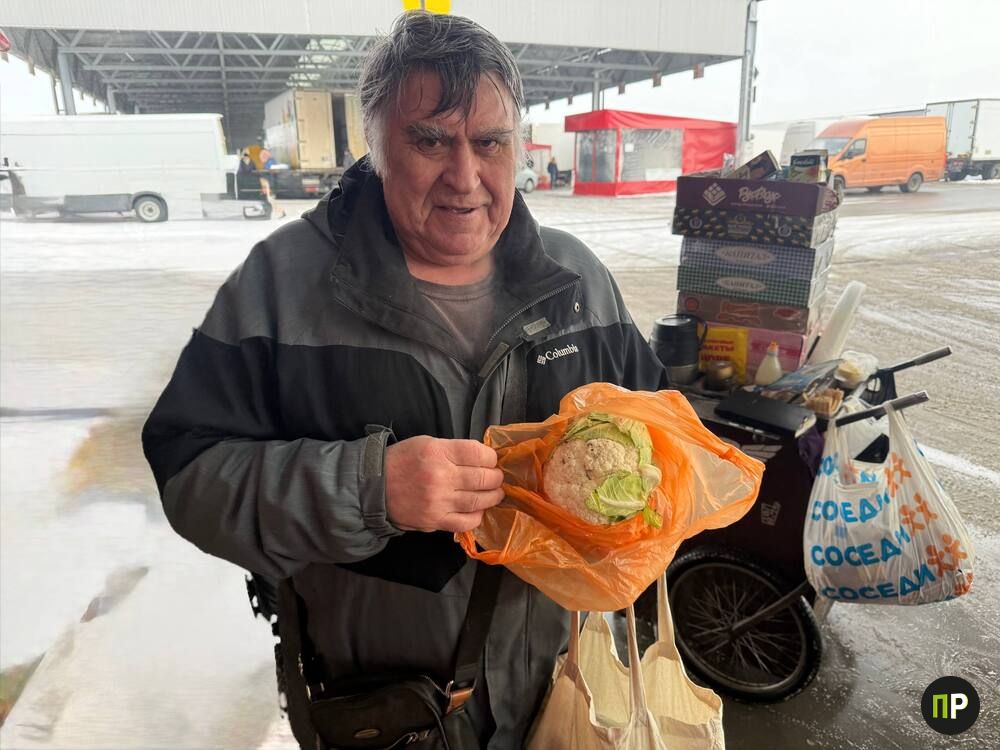 — Купили овощи, кофе, чай, ещё думаем взять ящик хурмы. Особенно сегодня довольны цветной капустой, — говорит он.