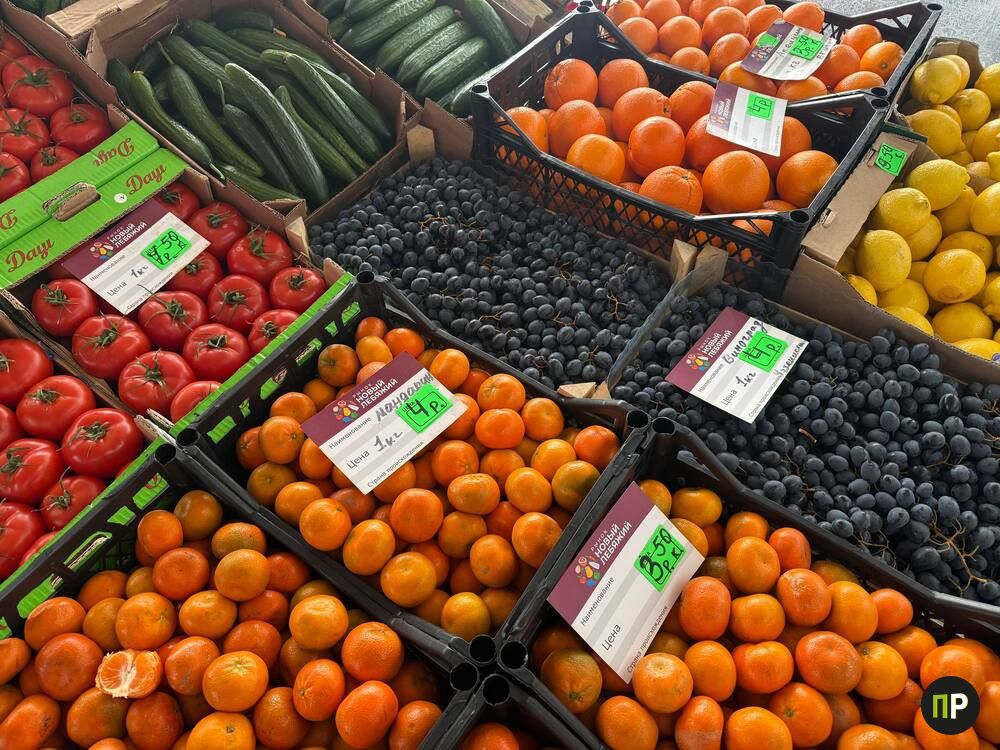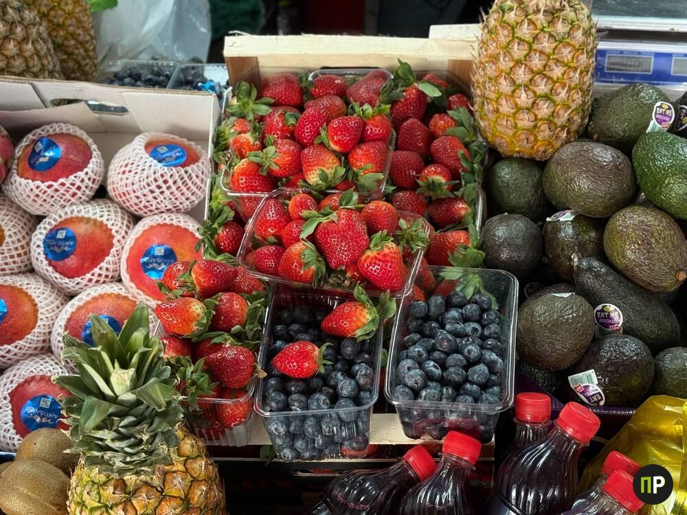 На фруктовых рядах были замечены мандарины по 4,5 рубля за килограмм, виноград по 4, бананы по 6,5. Грейпфруты на витрине стоят около 8 рублей, ананасы — по 15, гранаты из Сирии — по 13 рублей за килограмм, стоимость киви варьируется от 12 до 45 рублей в зависимости от страны происхождения и размера плодов.