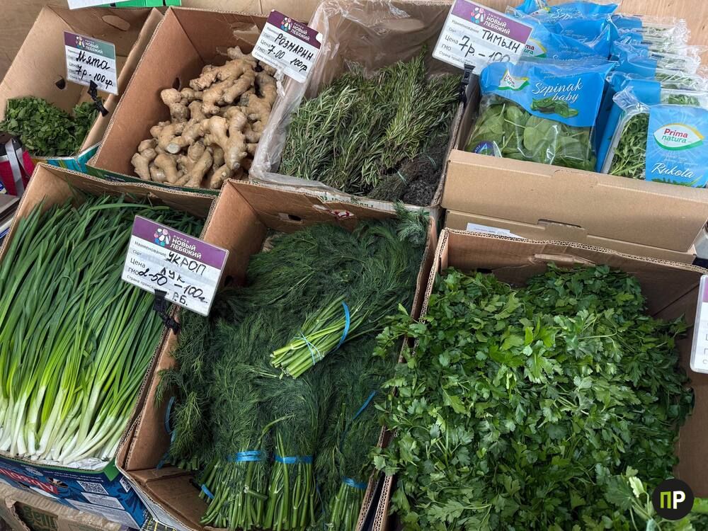 Зелёная витрина на Таборах остаётся одной из самых ярких. Лук, укроп и петрушку продают по 20 рублей за килограмм, салаты тоже уходят по 20, кинзу предлагают по 40 рублей, айсберг — по 9 рублей, брюссельскую капусту — по 20, дайкон — по 5 рублей, острый перец чили — по 25, имбирь — около 20 рублей.