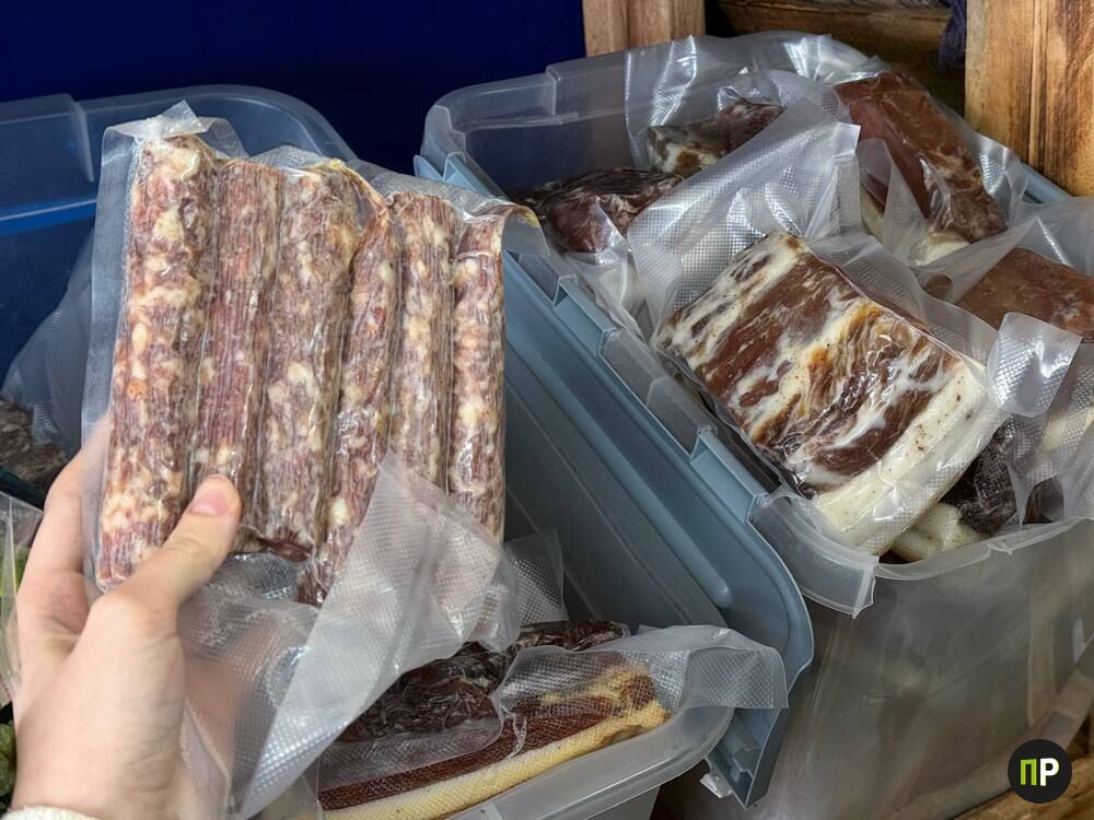 Рядом можно выбрать мясные деликатесы в вакууме: домашняя колбаса стоит около 30 рублей за килограмм, в среднем мясная продукция держится в районе 25–30 рублей.