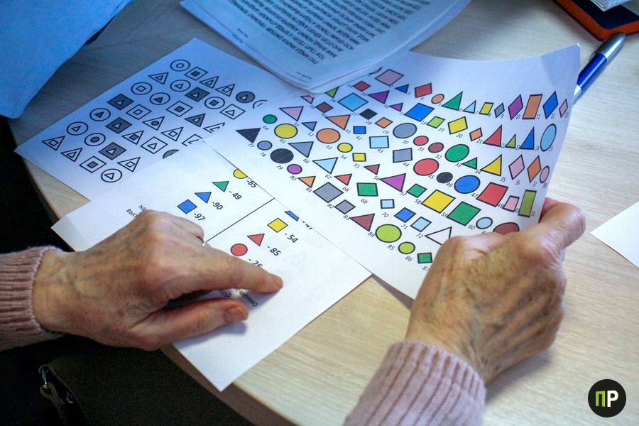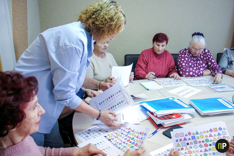2 раза в неделю женщины собираются, чтобы снять напряжение: они рисуют обеими руками и вспоминают правила русского языка, затем с азартом школьниц ищут пары геометрических фигур в таблицах, квадраты в треугольниках и прямо разбегающиеся в глазах наборы цифр, которые сложно «догнать». С улыбками и лёгким подтруниванием друг над другом в отделении обеспечения дневного пребывания для граждан пожилого возраста проходят занятия по профилактике когнитивных нарушений.