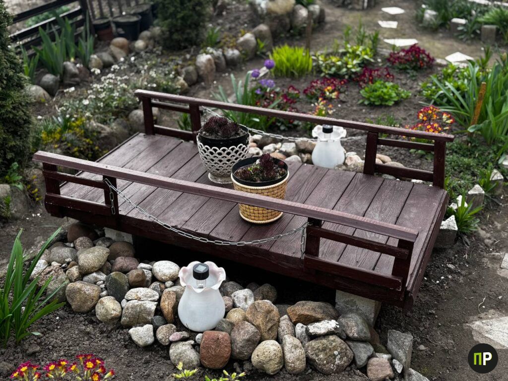 Есть здесь и маленький прудик, а ещё скамеечка с мостиком. Всё это она мастерила сама «по-женски»: из старого поддона с помощью молотка и гвоздей сбила мост и покрасила, а в основу лавки легла детская кроватка. Фонарики, что окружают скамеечку, работают на солнечных батареях. Ночью они загораются и напоминают светлячков.
