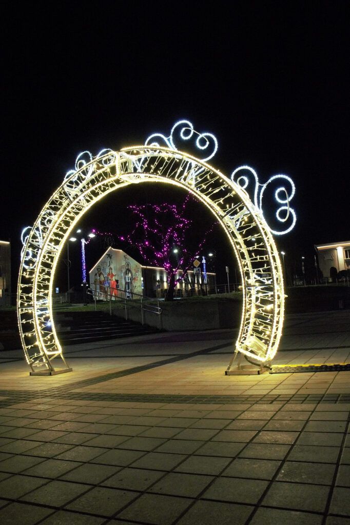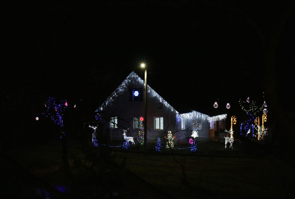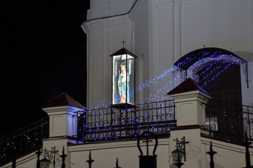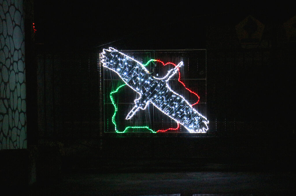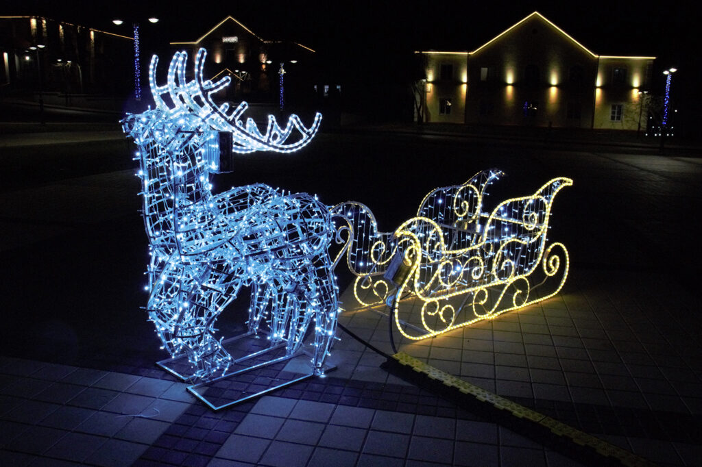В центре площади — величественная ель, она не просто украшена, она облачена в сотни мерцающих лампочек. Ветер, тот самый, что не принес снега, раскачивает их, и тогда кажется, что ёлка вздыхает, а с неё, отражаясь в стекле новогодних шаров, струится сияние переливчатых гирлянд. Этим огонькам вторят пространства парков, окна жилищ и абрисы строений, храмов, сказочные фигурки непривычно яркие на фоне серого асфальта, от миниатюрных до огромных, будто заблудившиеся из другого, снежного декабря.