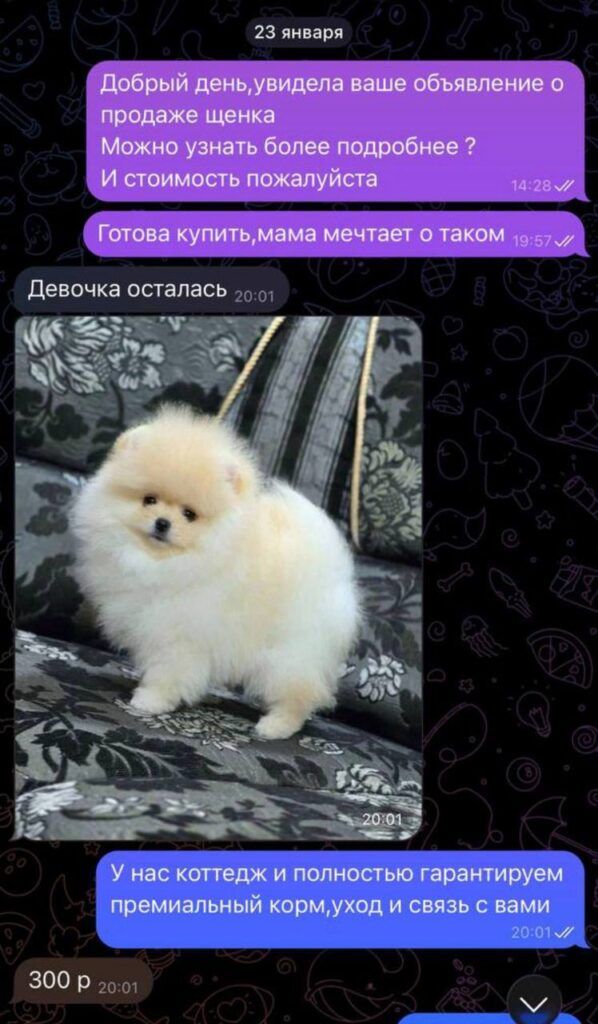 Несмотря на задержки, мужчина продолжал общение, утверждая, что на его щенков «большой спрос». Чтобы «гарантированно» получить собаку, он убедил покупательницу перевести оставшиеся 150 рублей полной стоимости.