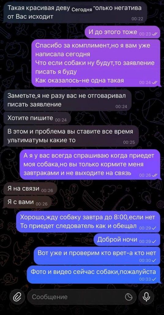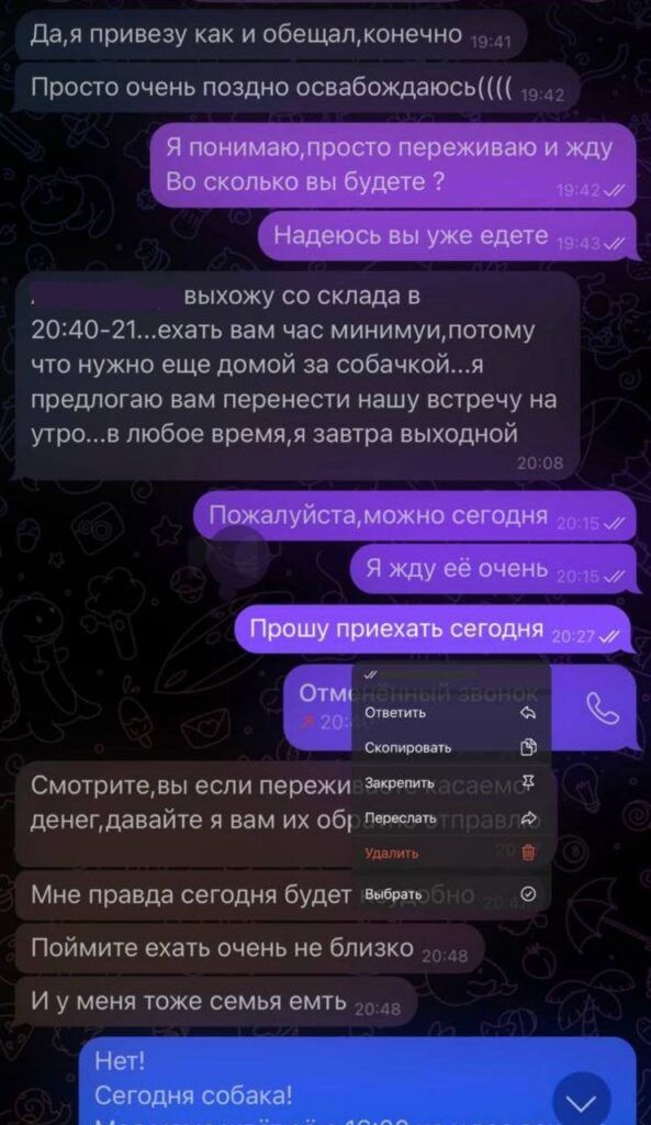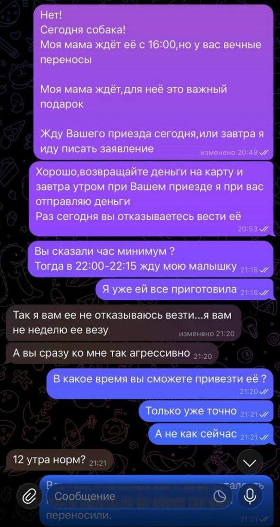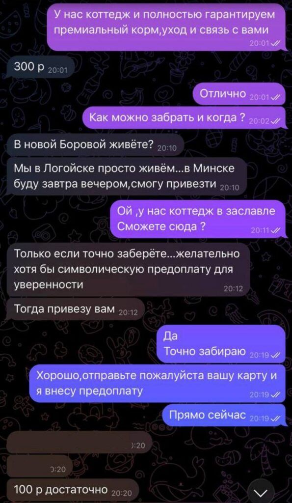 Далее продавец прислал сообщение, что щенка привезет сам девушке в Заславль, но ссылаясь на большое расстояние (дорога из Логойска), попросил в счет общей стоимости перевести еще 50 рублей на топливо, однако в течение последующих 2 дней щенка так и не привез, объясняя отсутствием свободного времени и занятости.