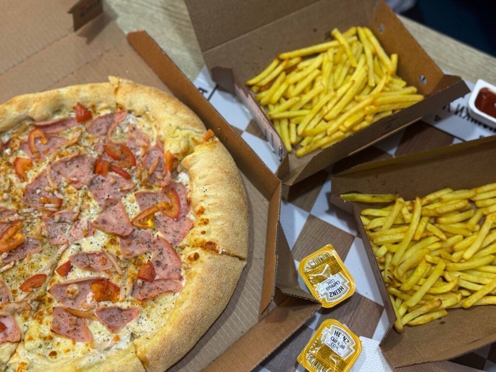 Наш заказ – одна пицца, две больших порции картошки фри и соусы – готовили около получаса. К тому времени, как нашу еду принесли, как раз освободился столик рядом с игровой зоной, и мы наконец-то смогли удобно разместиться. Еда оказалась свежей, горячей и очень вкусной. Единственным разочарованием стала ситуация с напитками: дочь попросила сок, но в пиццерии не оказалось маленьких порций, и нам пришлось купить литровую упаковку. Итоговый чек вышел около 70 рублей.