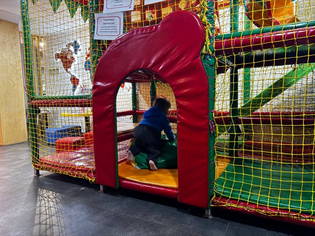 Наш визит пришелся на семь часов вечера, и в зале не было ни одного свободного стола. Детская зона напоминала поле боя: в тесном лабиринте одновременно играли дети от 2 до 10 лет.