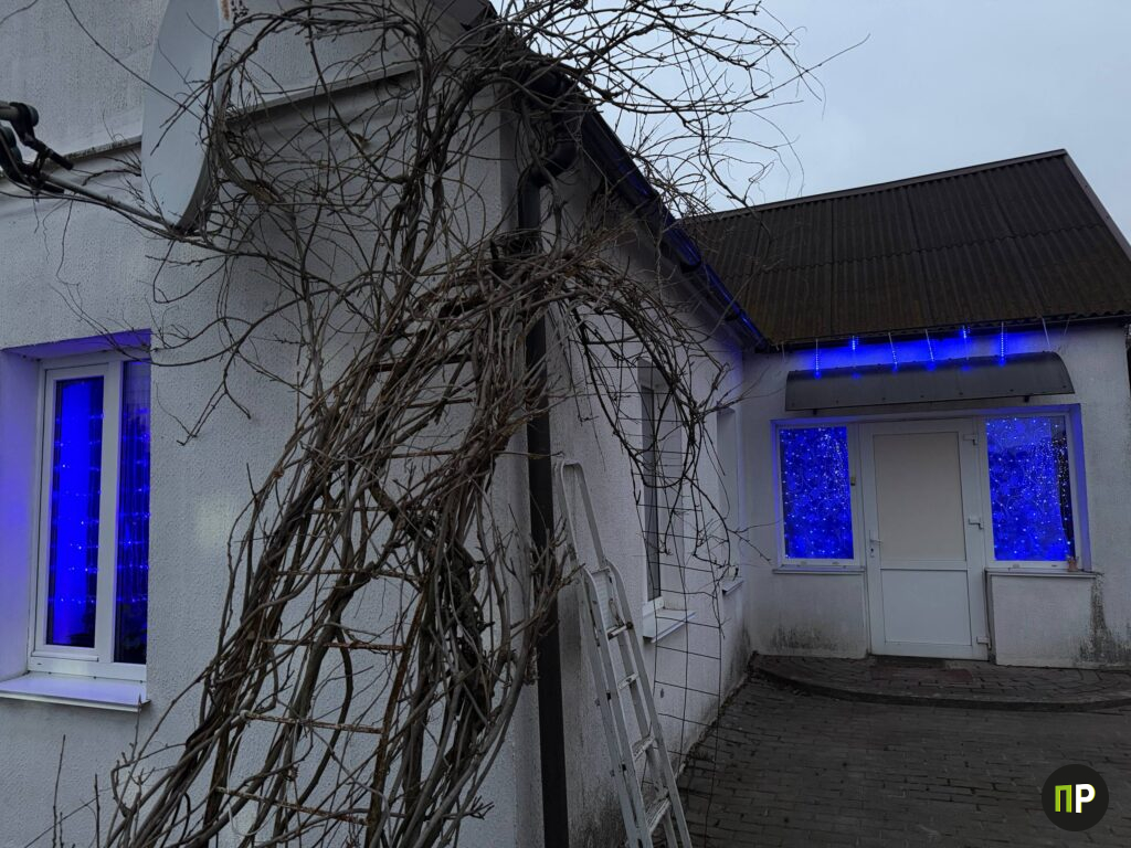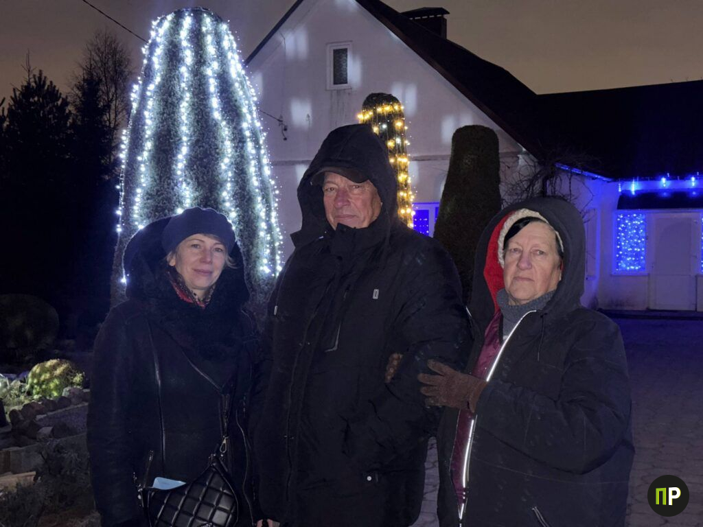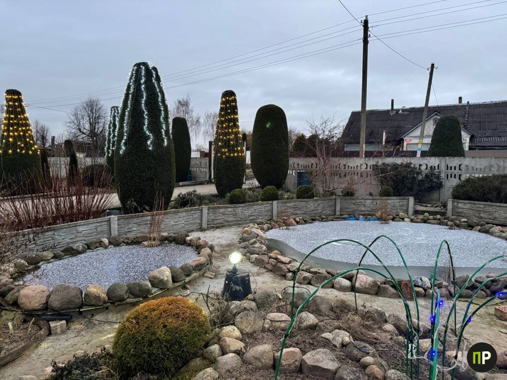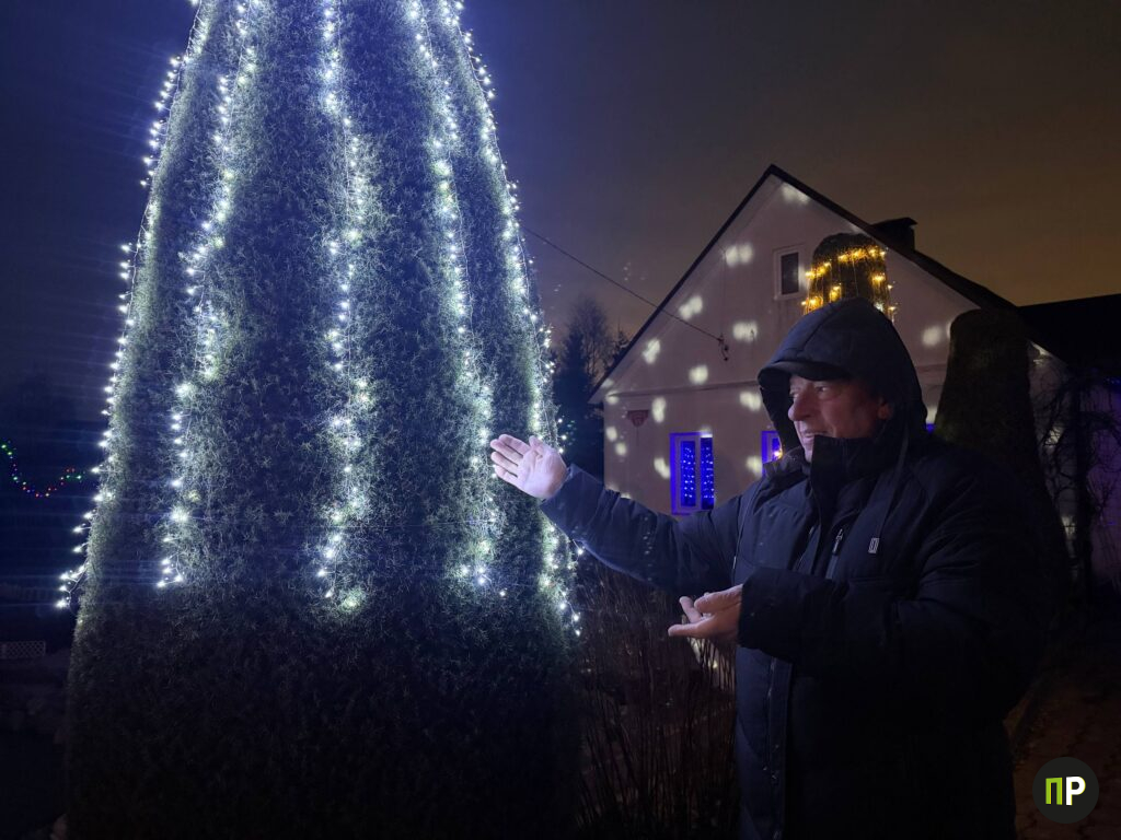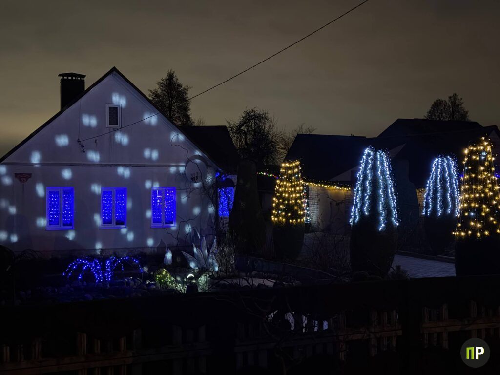 Во дворе у Татьяны Коваленко и Геннадия Мотькина в Щитомиричах зима – особенное время. Пока деревня живёт привычной сельской жизнью, их участок превращается в светящийся ботанический сад: по кронам хвойников бегут огоньки, дом и хозяйственные постройки обведены гирляндами, а к крыльцу ведёт настоящая сказочная аллея. По фасаду и земле «рисуют» узоры два проектора, а дальше, как из рождественской открытки, сияет пятиметровая ель.