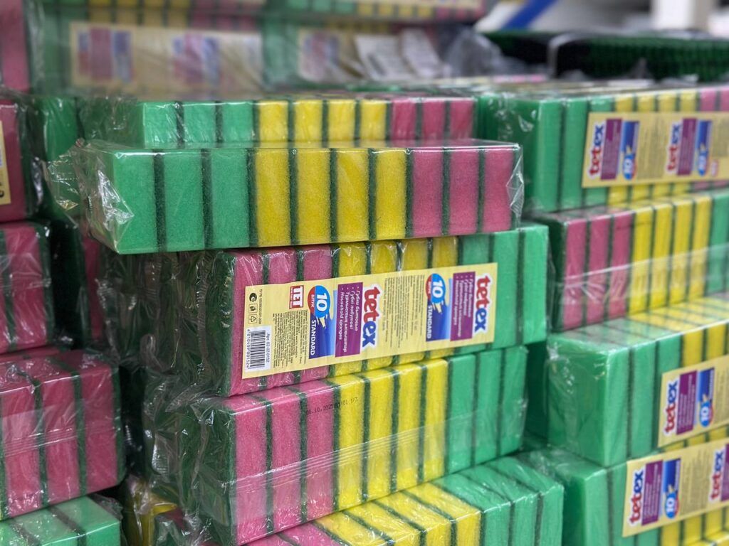 Тут мы нашли бумажные полотенца Zewa за 2,77 BYN, а MEGA — 1000 листов за 7,17 BYN. Губки для мытья посуды — 10 штук за 1,39 BYN, антиналетное средство для кухни — 4,60 BYN, а дезинфицирующий гель для туалета за 4,98 BYN.