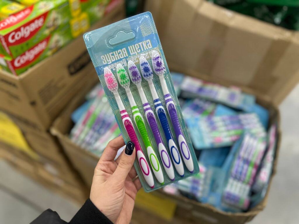 Прокладки Napee — 1,46 BYN за 10 штук, Pomiks — чуть дороже, 2,44 BYN. Мыло для рук — упаковка из пяти брусков обойдется всего в 3,09 BYN, а зубные щетки на всю семью (набор из 5 штук) — 1,85 BYN.