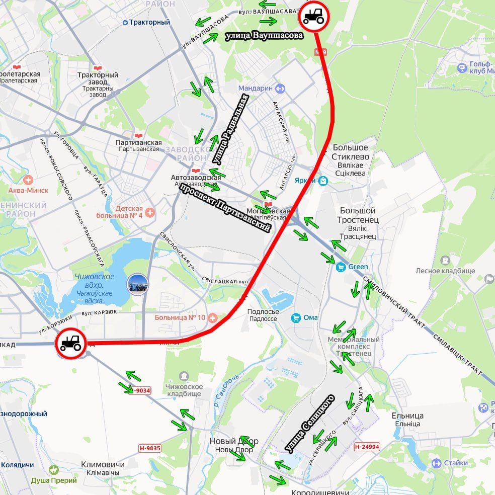 Под запрет попадает движение колесных тракторов и самоходных машин на участке от развязки с местным проездом ул. Ваупшасова и ул. Липковской до развязки с ул. Виктора Турова и автодорогой Н-9034.