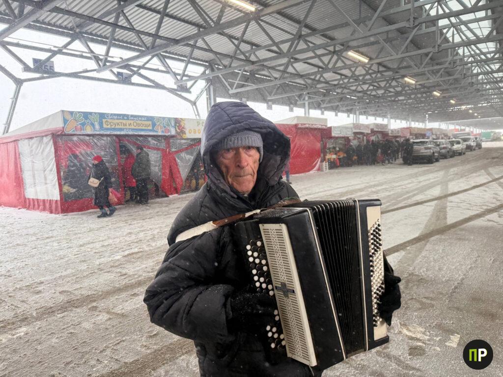 На улице разыгралась зимняя метель, ветер задувает под навесы, но людей это не останавливает: к рядам выстраиваются очереди покупателей. В одном из проходов 85‑летний Алекс с баяном играет знакомые мелодии. Покупатели останавливаются, улыбаются, кто‑то снимает на телефон, кто‑то подпевает. Музыкант признаётся, что просто хотет поднять людям настроение перед праздником.