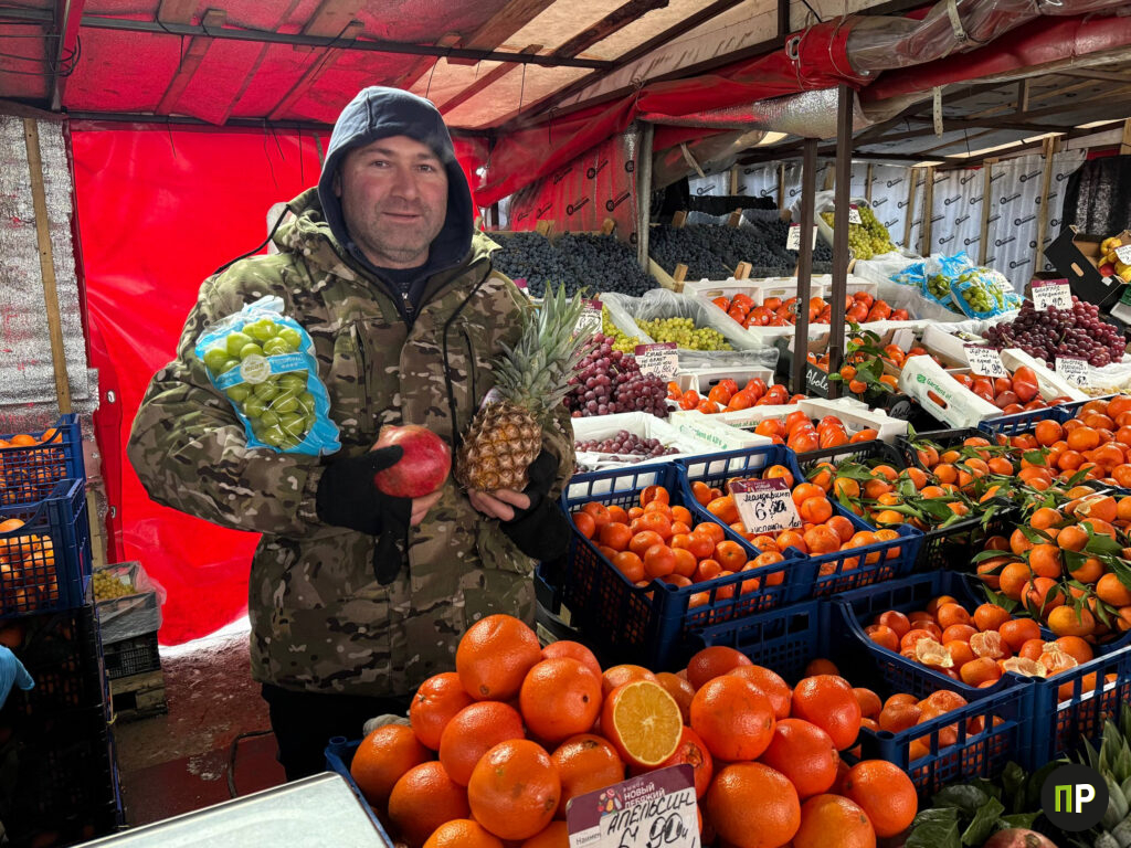 Покупательница Наталья приехала с мужем из соседнего Хатежино и собирает всё необходимое к столу: несколько килограммов мандаринов, виноград, ананасы, другие фрукты и овощи.