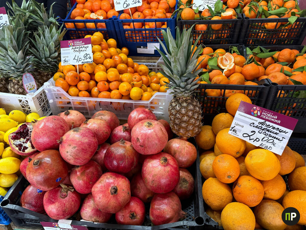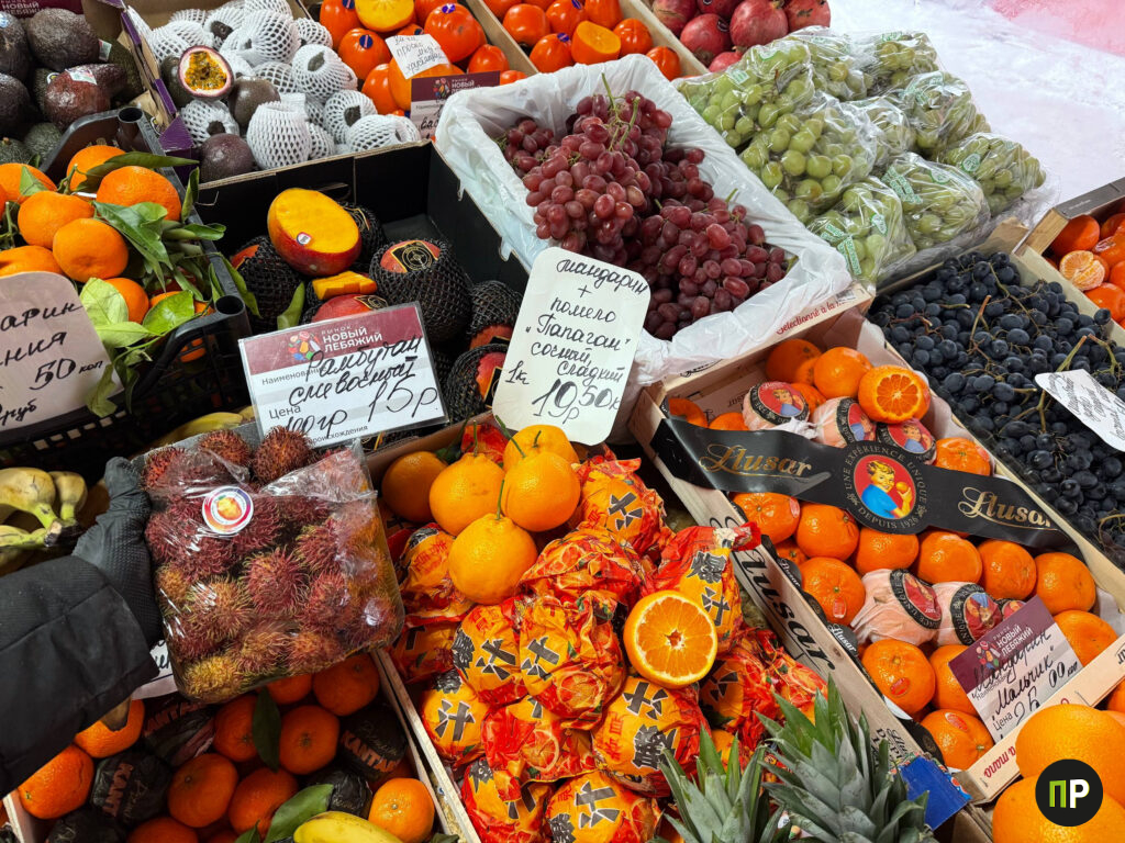 Самые ходовые позиции — цитрусы и классика новогоднего стола. Мандарины предлагают по 4,9 рубля за килограмм, апельсины от 2 рублей, лимоны по 6. Виноград в рознице начинается от 4,9 рублей за килограмм, киви продают по 6. Хурма стоит около 4 рублей, крупный гранат — 10 рублей за килограмм.