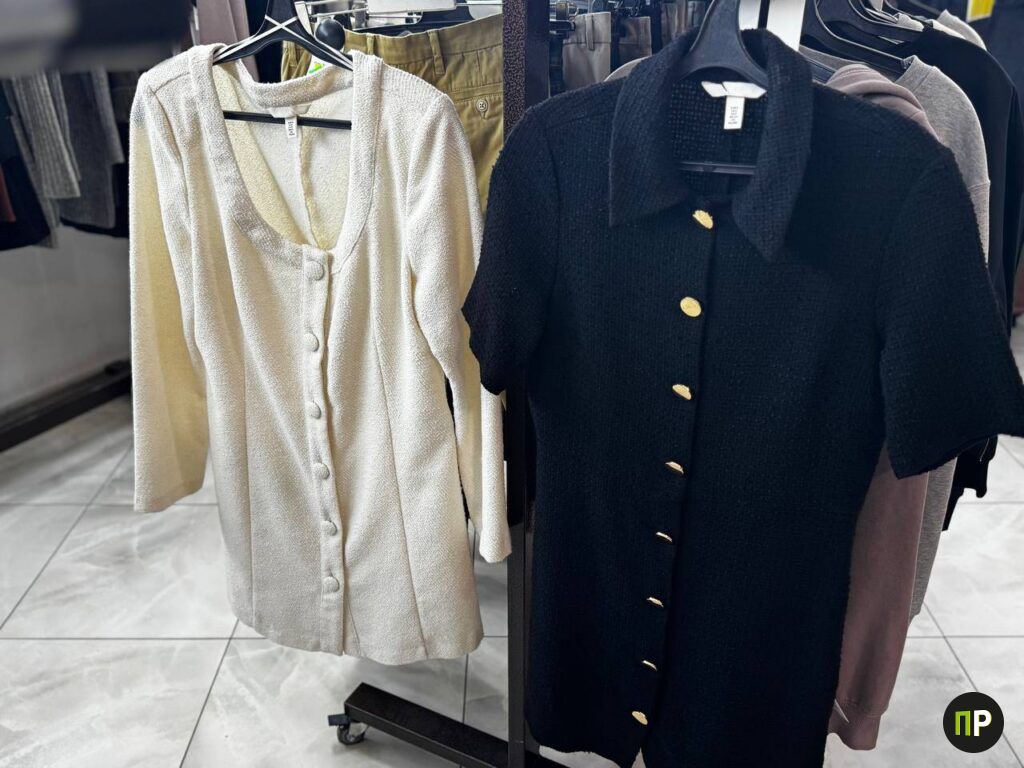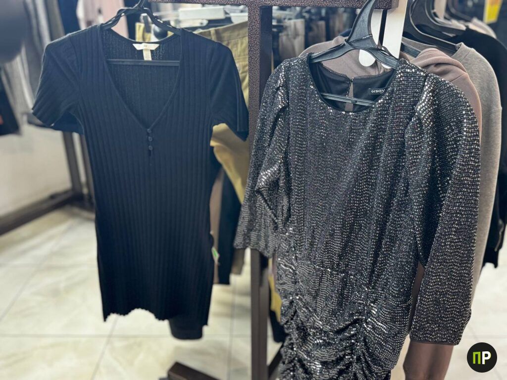 Внимания здесь заслуживают платья. Самые бюджетные варианты стоят всего от 15 рублей — например, чёрное платье мелкой вязки мы нашли на скидках именно за эту цену. Есть очень нарядные с пайетками за 18 рублей, есть трикотажные — более удобные и тёплые, на каждый день. Если нужно что-то строже, приготовьтесь заплатить больше: твидовое классическое чёрное платье мы нашли за 65 рублей, а молочное — за 75.